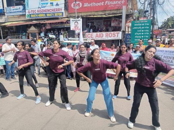 District 318B took mental health awareness to the streets of Kozhencherry. Around 150 nursing students from Muthoot Hospital, Poyyanil Hospital, and the Government Nursing College in Elanthur joined hospital staff, local panchayat leaders, and Lions in a procession through town—a visible reminder that mental health matters. The real showstopper came at the bus stand, where nursing students staged a flash mob—dancing, miming, and performing short skits that stopped commuters in their tracks. The message, delivered through movement rather than words, was clear: mental health deserves our attention.